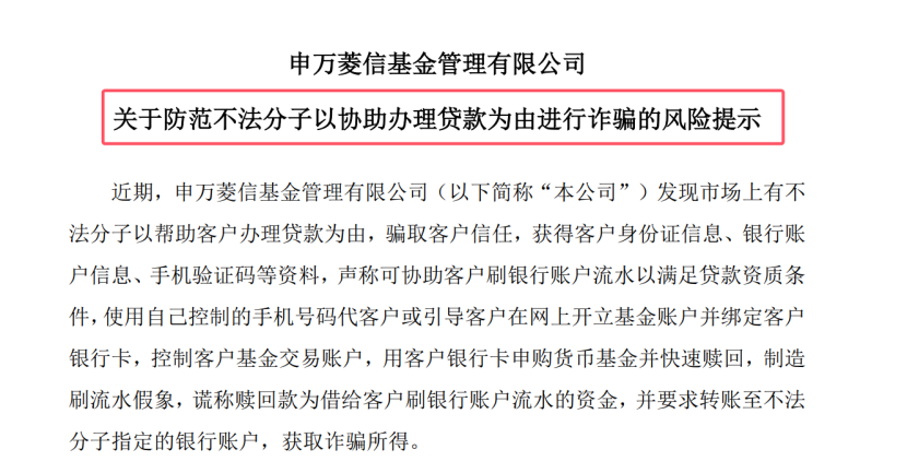 一是以協助辦理貸款為由進行詐騙。申萬菱信基金1月18日公告顯示,不法分子以幫助客戶辦理貸款為由,騙取客戶信任,獲得客戶身份證信息、銀行賬戶信息、手機驗證碼等資料,聲稱可協助客戶刷銀行賬戶流水以滿足貸款資質條件,使用自己控制的手機號碼代客戶或引導客戶在網上開立基金賬戶并綁定客戶銀行卡,控制客戶基金交易賬戶,用客戶銀行卡申購貨幣基金并快速贖回,制造刷流水假象,謊稱贖回款為借給客戶刷銀行賬戶流水的資金,并要求轉賬至不法分子指定的銀行賬戶,獲取詐騙所得。