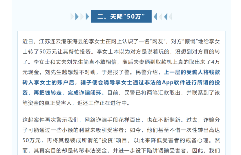 以天降“50萬”案例為例,諾安基金《文章》顯示,江蘇連云港東海縣的李女士在網上認識了一名“網友”,對方“慷慨”地給李女士轉了50萬元讓其幫忙投資。李女士本以為對方是說著玩的,沒想到對方真的轉了。李女士和丈夫劉先生簡直不敢相信,隨后夫妻倆到取款機上真的取出來了4萬元現金。劉先生越想越不對勁,于是報了警。民警介紹,上一層的受騙人將錢款轉入李女士的賬戶后,騙子便會誘導李女士通過非法的App軟件進行所謂的投資,再把錢轉走,完成詐騙閉環。